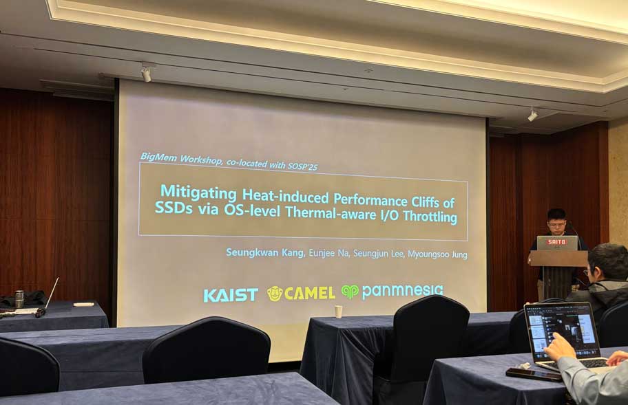 Seungkwan Kang presented his paper “Mitigating Heat-induced Performance Cliffs of SSDs via OS-level Thermal-aware I/O Throttling” at the SOSP BigMem Workshop. This work addresses the critical issue of thermal-induced performance degradation in NAND flash-based SSDs. While modern SSDs leverage massive internal parallelism for high performance, their reliability deteriorates under high thermal stress, which accelerates charge loss and worsens data retention. Existing SSDs rely on simple firmware-level throttling using dynamic voltage and frequency scaling (DVFS), which often causes severe and long-lasting performance drops—referred to as thermal cliffs. To overcome these challenges, the authors propose the Linux Thermal-aware Throttler (LTT), an OS-level framework that continuously monitors and learns the SSDs’ thermal behavior and proactively regulates host I/O submission rates before the devices reach their critical temperatures.